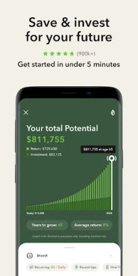 Your money is automatically invested into one of our diversified, ETF portfolios, built by experts and recommended for you. You can invest spare change each time you make a purchase with the Round-Ups® feature or set up automated recurring investments starting as low as $5.