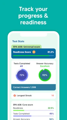 Additionally, our mobile app provides a personalized study plan based on your skill level, study frequency, and target test date. Not sure when you want to take the exam? You can adjust your study plan as often as you like. Our proprietary readiness score will help you determine when you’re ready to take the real EPA 608 certification exams (Universal, Core, Type I, Type II, and Type III) and pass with a high score on your first try.