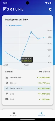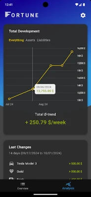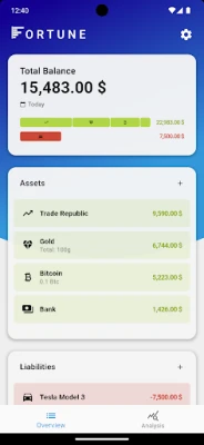 This app gives you an overview of all your assets and liabilities. If you regularly add snapshots of your overview to the database, you get many statistics on your wealth development. See which of your assets have developed best over time and get many plots and visualizations of the trends.