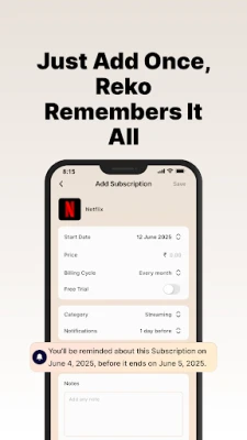 Reko helps you take control of your subscriptions. Whether it's Netflix, Spotify, gym memberships, or app trials — manage everything from one clean, minimal dashboard.